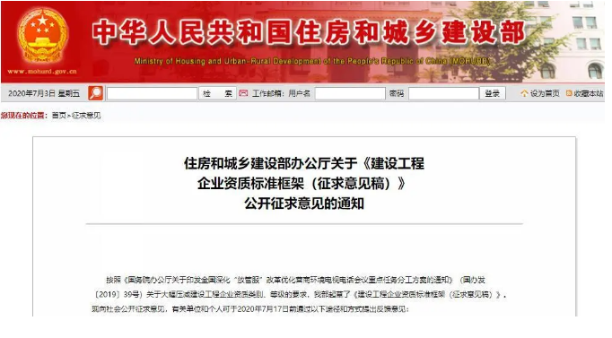7月2日,住建部發(fā)布《住房和城鄉(xiāng)建設部辦公廳關于<建設工程企業(yè)資質標準框架(征求意見稿)>公開征求意見的通知》,在通知中明確: