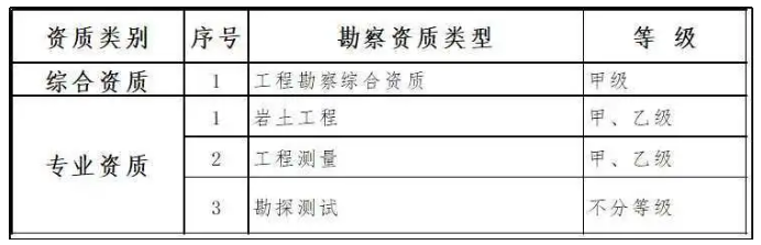 保留綜合資質。將4類專業(yè)資質及勘察勞務資質整合為巖土工程、工程測量、勘探測試等3類專業(yè)資質。專業(yè)資質等級壓減為甲、乙兩級(勘探測試專業(yè)資質不分等級),原丙級資質并入相應專業(yè)乙級資質。