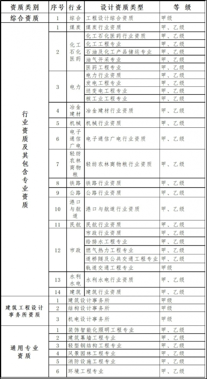 保留綜合資質。對部分行業(yè)資質進行整合,其中,冶金行業(yè)與建材行業(yè)合并為冶金建材行業(yè)資質,輕紡行業(yè)、農林行業(yè)、商物糧行業(yè)合并為輕紡農林商物糧行業(yè),電子行業(yè)、通信行業(yè)、廣電行業(yè)合并為電子通信廣電行業(yè),石油天然氣行業(yè)并入化工石化醫(yī)藥行業(yè),軍工行業(yè)并入機械行業(yè),核工業(yè)行業(yè)并入電力行業(yè),資質等級壓減為甲、乙兩級,原丙級資質并入相應行業(yè)乙級資質。取消海洋行業(yè)及專業(yè)資質,相關企業(yè)可以換發(fā)相近行業(yè)資質。整合原化工石化醫(yī)藥、石油天然氣、電力、市政行業(yè)中的專業(yè)資質,資質等級壓減為甲、乙兩級,原丙級資質并入相應專業(yè)乙級資質;取消其他行業(yè)的專業(yè)資質,并入相應行業(yè)資質,原甲、乙級專業(yè)資質并入相應等級的行業(yè)資質,原丙級專業(yè)資質并入乙級行業(yè)資質。將專項資質調整為通用專業(yè)資質,取消環(huán)境工程專項資質的5個專項類別,整合為環(huán)境工程專業(yè)資質,資質等級壓減為甲、乙兩級,原丙級資質并入相應專業(yè)乙級資質。保留3類事務所資質。新3.jpg