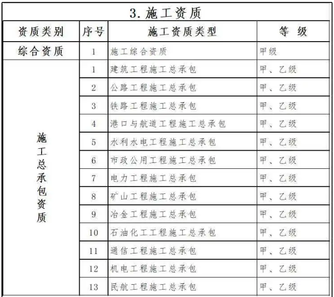 將施工總承包特級資質調整為施工綜合資質,取得原10類施工總承包特級資質中的任一類,即可換發(fā)綜合資質。取得綜合資質的企業(yè),可承擔各類別、各等級施工總承包業(yè)務,不再申請或持有其他施工資質。
