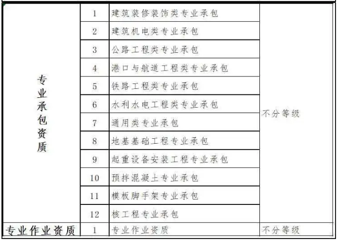 保留地基基礎工程、起重設備安裝工程、核工程等專業(yè)承包資質;將原專業(yè)承包資質整合為建筑裝修裝飾類、建筑機電類、公路工程類、港口與航道工程類、鐵路工程類、水利水電工程類、通用類專業(yè)承包資質;專業(yè)承包資質不分等級。