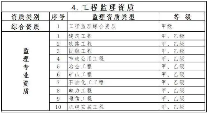 保留綜合資質。取消水利水電工程、公路工程、港口與航道工程等專業(yè)資質,其資質要求執(zhí)行有關行業(yè)主管部門規(guī)定。取消農林工程監(jiān)理資質,建設單位委托農林工程監(jiān)理業(yè)務時,不再作資質要求。上述4個監(jiān)理專業(yè)資質取消后,相關企業(yè)可以換發(fā)相近專業(yè)同等級監(jiān)理專業(yè)資質。監(jiān)理專業(yè)資質等級壓減為甲、乙兩級,原丙級資質并入相應專業(yè)的乙級資質。取消事務所資質。