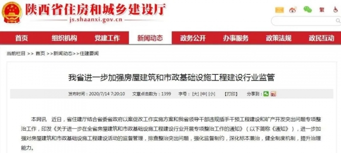 7月14日,陜西省住房和城鄉(xiāng)建設(shè)廳官網(wǎng)發(fā)布消息稱(chēng),近日印發(fā)了《關(guān)于進(jìn)一步在全省房屋建筑和市政基礎(chǔ)設(shè)施工程建設(shè)行業(yè)開(kāi)展專(zhuān)項(xiàng)整治工作的通知》(以下簡(jiǎn)稱(chēng)《通知》),加強(qiáng)對(duì)房屋建筑和市政基礎(chǔ)設(shè)施工程建設(shè)活動(dòng)的監(jiān)督管理。