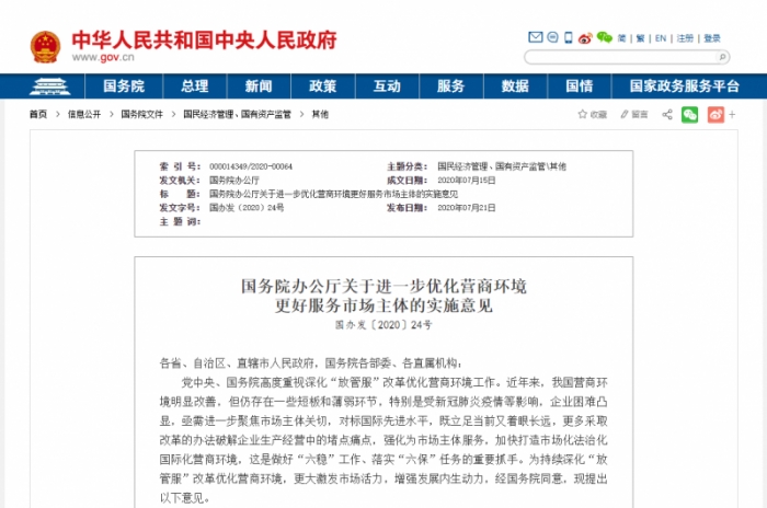 7月21日,國務(wù)院辦公廳下發(fā)《關(guān)于進(jìn)一步優(yōu)化營商環(huán)境更好服務(wù)市場主體的實施意見》,要求,采取改革的辦法破解企業(yè)生產(chǎn)經(jīng)營中的堵點痛點,強化為市場主體服務(wù),加快打造市場化法治化國際化營商環(huán)境。從6個方面,提出了20項任務(wù)。其中,1項由住建部牽頭落實,6項住建部分工負(fù)責(zé)。明確,2020年底前將工程建設(shè)項目審批涉及的行政許可、備案、評估評審、中介服務(wù)、市政公用服務(wù)等納入線上平臺,公開辦理標(biāo)準(zhǔn)和費用。