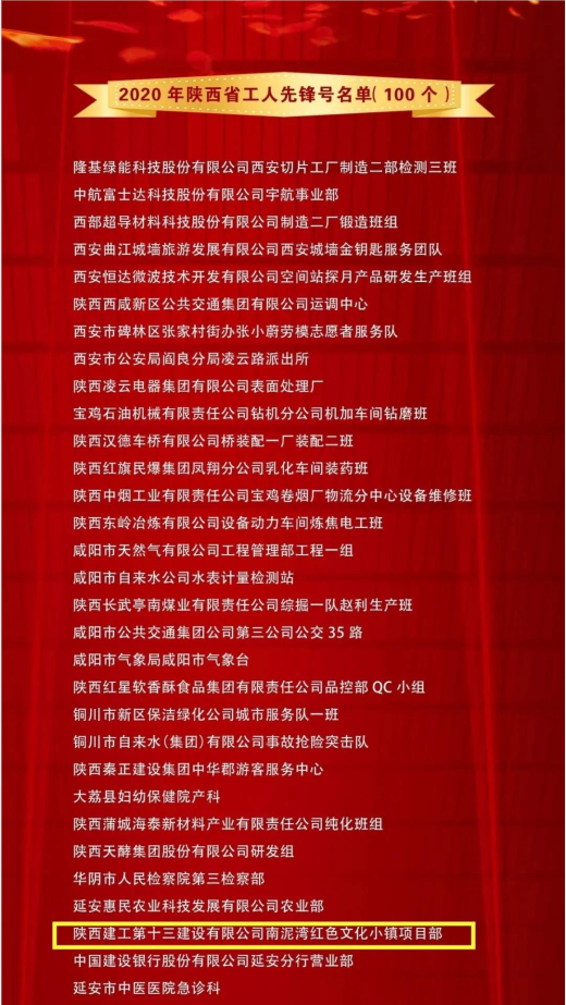 近日,陜西省三秦工匠、五一勞動獎表彰大會在西安隆重舉行,會議表彰了2020年三秦工匠 和陜西省五一勞動獎、工人先鋒號。陜西建工第十三建設(shè)有限公司南泥灣紅色文化小鎮(zhèn)項(xiàng)目部榮獲2020年“陜西省工人先鋒號”榮譽(yù)稱號。