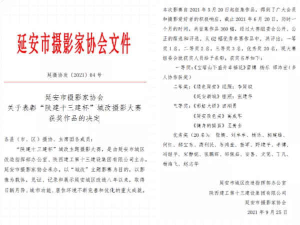 9月29日,由延安市城區(qū)改造指揮部辦公室聯(lián)合陜西建工第十三建設(shè)集團(tuán)有限公司主辦、延安市攝影家協(xié)會(huì)承辦的“陜建十三建杯”城改攝影比賽頒獎(jiǎng)儀式暨獲獎(jiǎng)作品展在延安市小東門(mén)廣場(chǎng)圣地影像畫(huà)廊圓滿舉行。