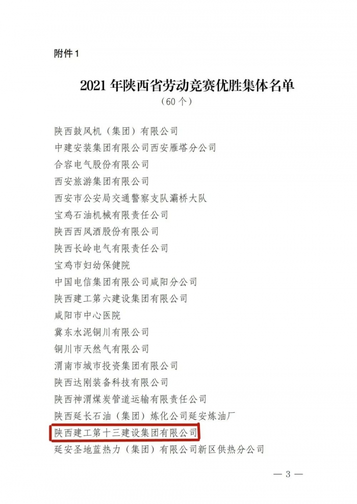 近日,陜西省勞動競賽委員會公布了2021年陜西省勞動競賽優(yōu)勝集體和優(yōu)秀個人名單。陜建十三建集團(tuán)被評為陜西省勞動競賽優(yōu)勝集體。
