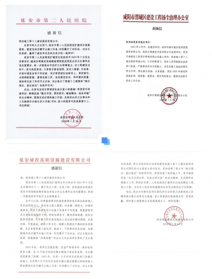 近日,集團第二工程公司施工的延安市第二人民醫(yī)院改擴建項目、咸陽渭城商務(wù)功能區(qū)項目收到建設(shè)單位發(fā)來的感謝信、表揚信,對集團在項目高質(zhì)量建設(shè)中的傾情付出表示感謝,為項目團隊在施工過程中表現(xiàn)出的敬業(yè)精神表示贊揚。