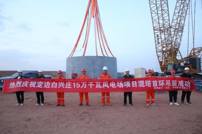 近日,集團(tuán)新型建材公司為中材海外榆林定邊白興莊150MW風(fēng)電場項(xiàng)目生產(chǎn)的混凝土塔筒管片首環(huán)吊裝順利完成。